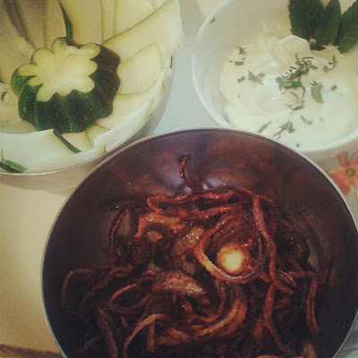 Et puis petit a petit mon menu c'est mis en place, j'allais faire un sauté de porc au caramel , avec des tagliatelles de courgettes crues, et une sauce creme fraiche legere-menthe, et juste pour the touche finale et le coté croquant, j'allais faire frire des oignons....